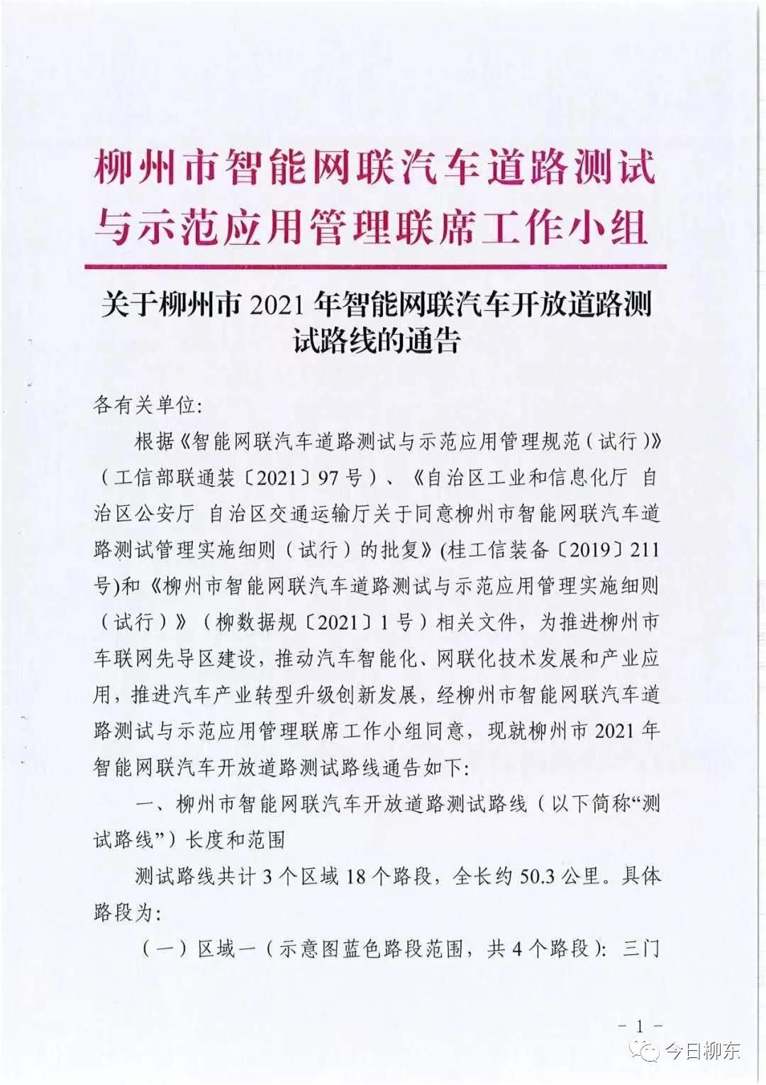 《关于柳州市2021年智能网联汽车开放道路测试路线的通告》