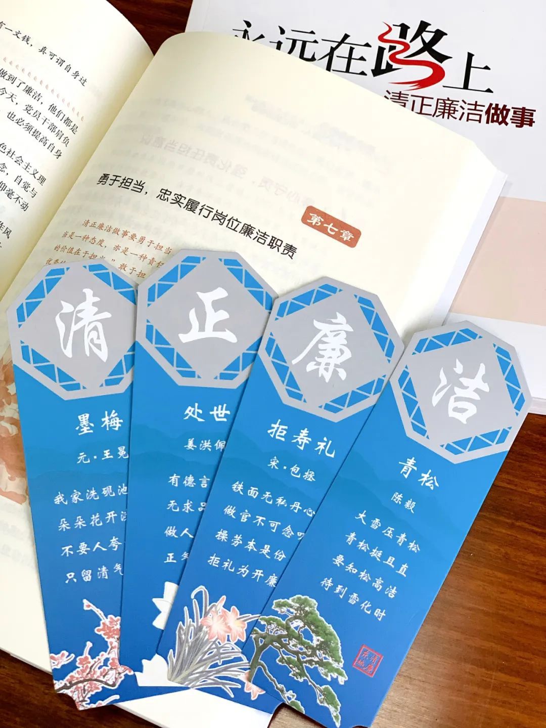 经典诗句话廉洁。廉洁书签更应人注目的是每一联上的经典诗词,包括元代王冕的《墨梅》、姜洪佩的《处世》、宋代包拯的《拒寿礼》和陈毅的《青松》。通过选取这四首咏廉明志的诗词,以耳熟能详的经典诗句让干部职工在工作过程中,自觉地学廉思廉,自警自省。
