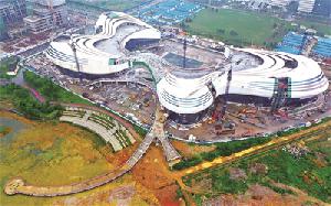 图为工人们在柳东新区文化广场外部进行施工。近日,记者在柳东新区的文化广场项目施工现场...